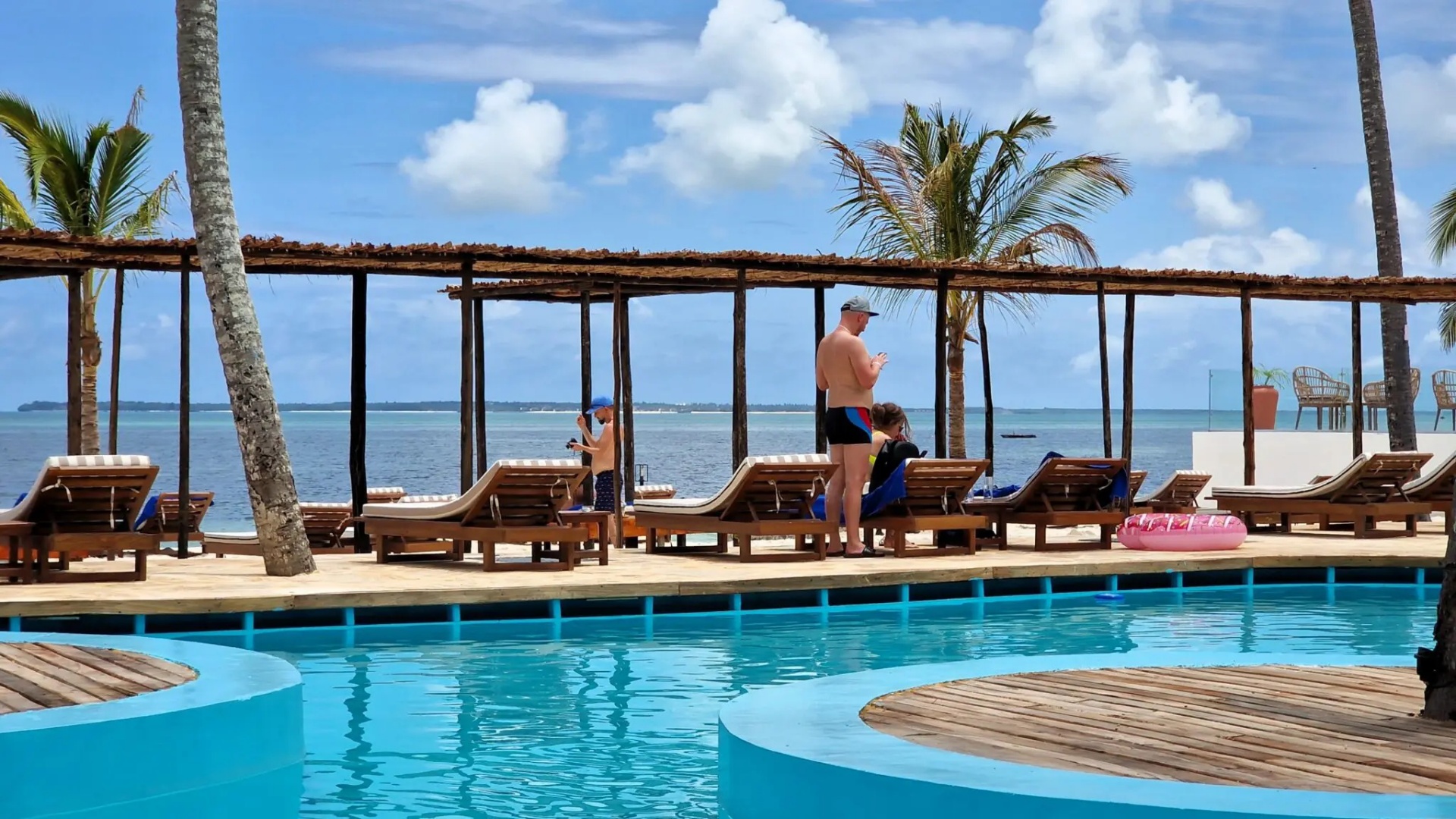 Resort pool with blue mosaic tiles, wooden deck and cushioned sunbeds beneath a thatched terrace by trees.