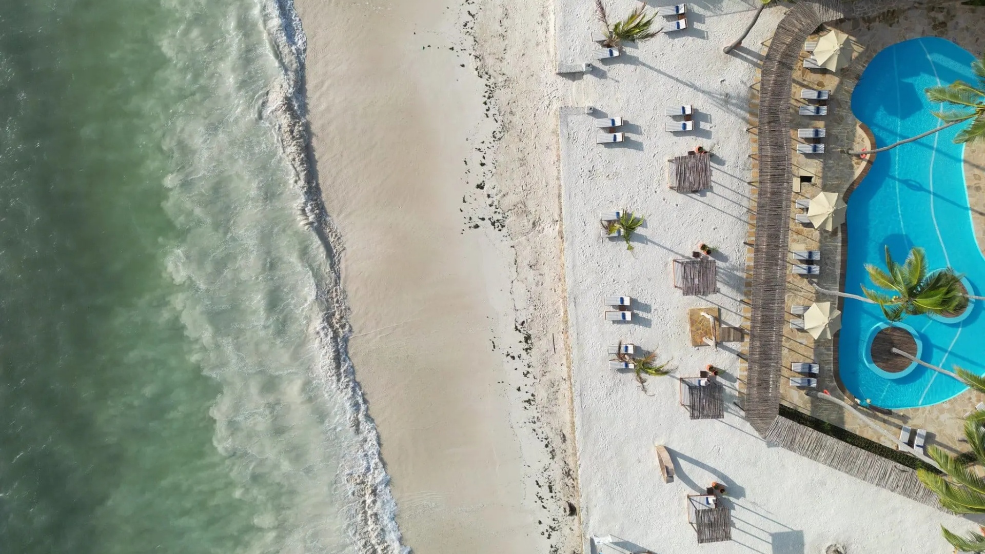 Tropical beachfront resort with white-sand beach, palm-shaded palapas, sun loungers, thatched villas and lagoon pool.