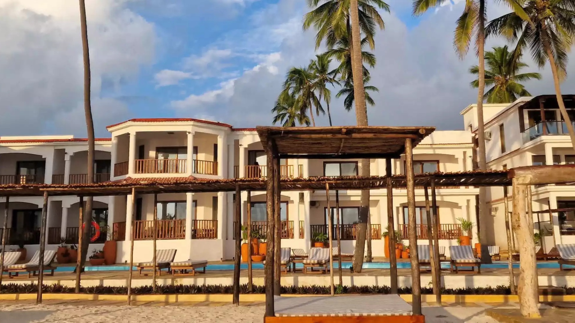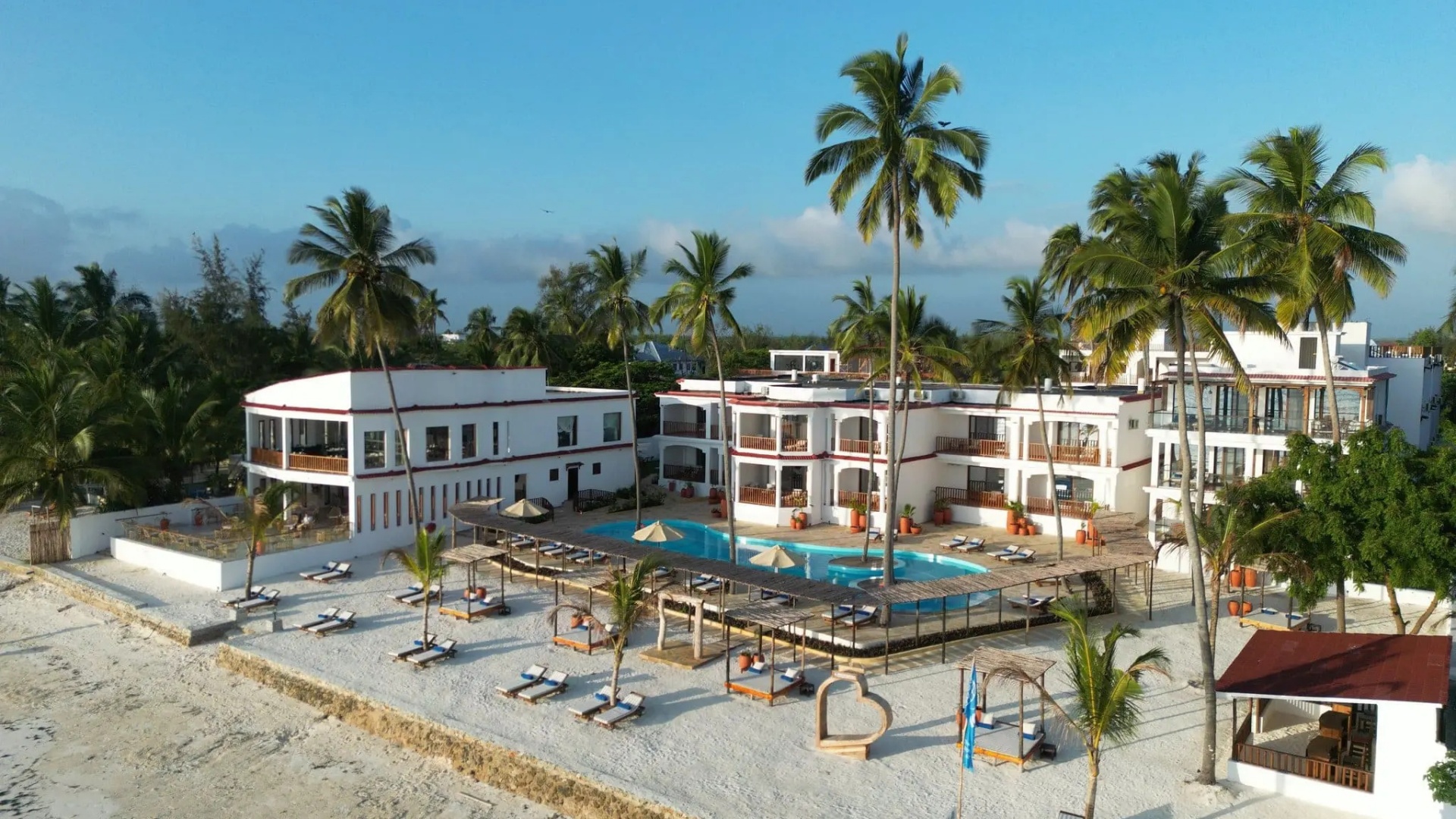 Oceanfront resort with white two-story buildings and palm trees, sandy beach, turquoise sea, poolside loungers and shaded cabanas.