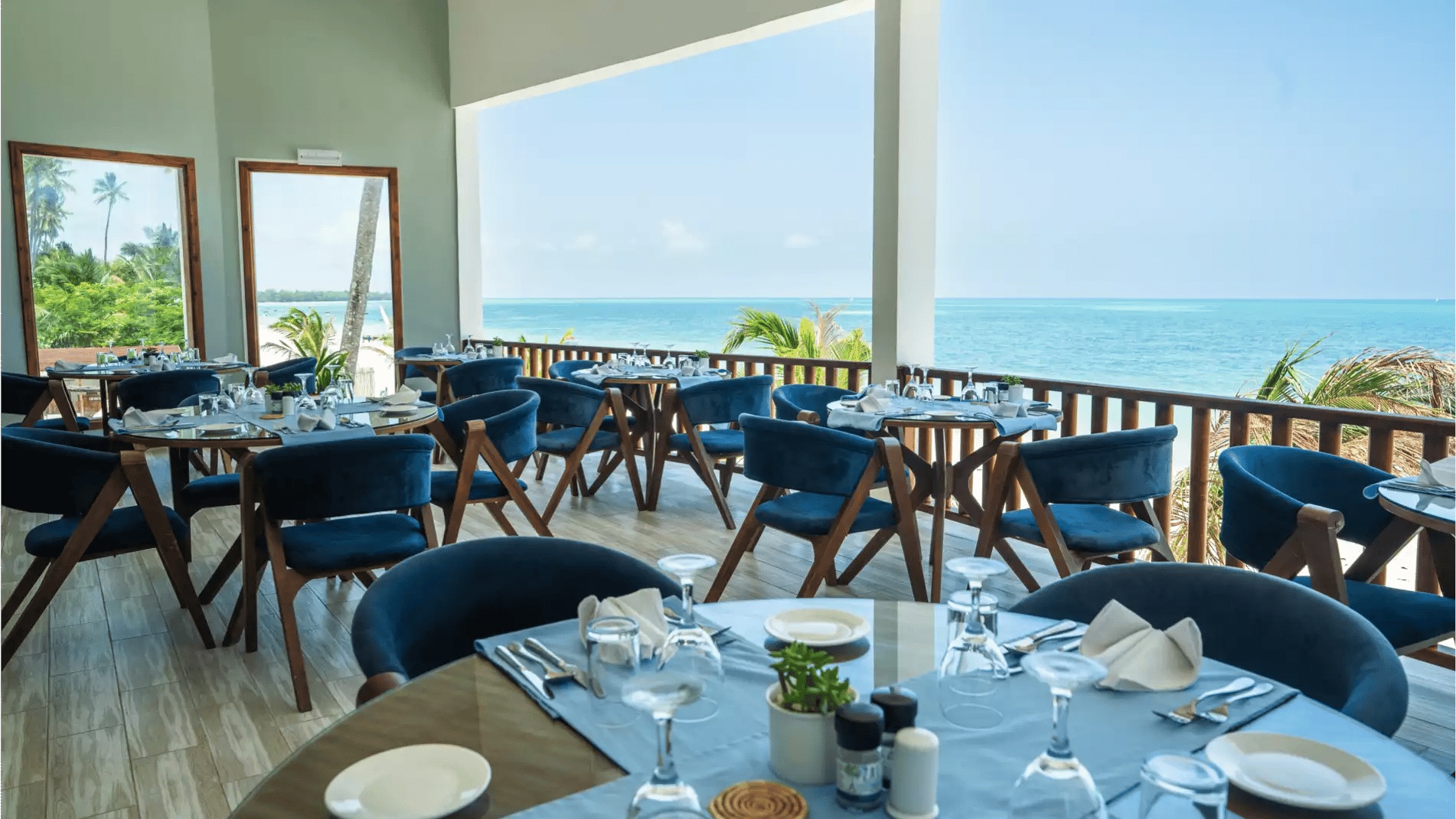 Beachfront resort with turquoise sea and white sand, palm-lined grounds, thatched-roof pavilions, pools and balcony rooms.