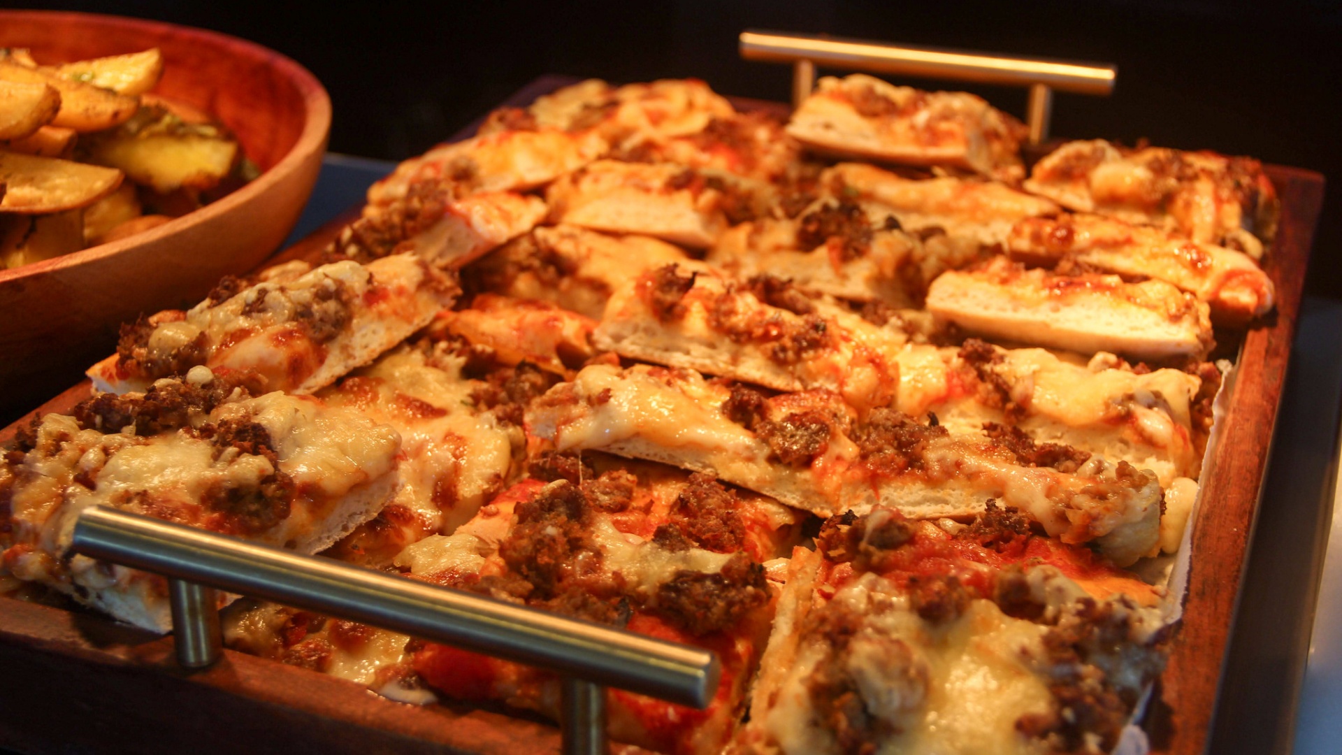 Poolside with thatched umbrellas and wooden loungers, glamping tents beyond, lush lawn and bushland view